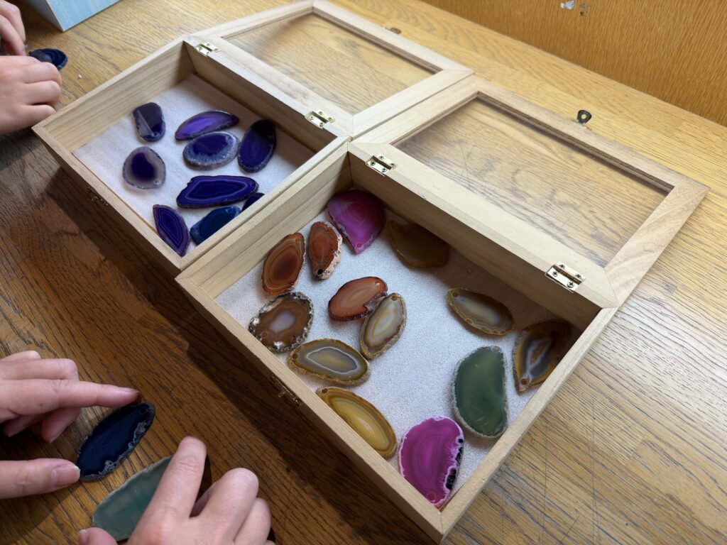 めのう細工体験では、好きなめのうを選んで模様を下書きして、下書きした模様をカッターなどで切り抜いていきます。