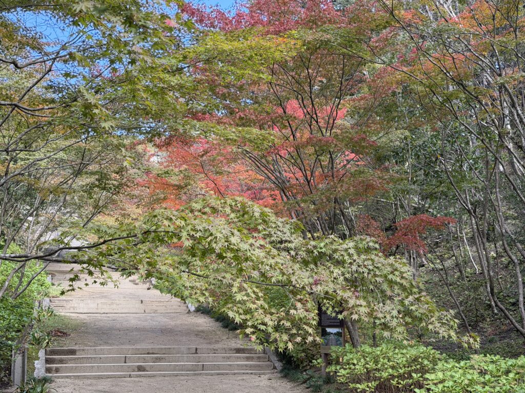 もみじを中心に紅葉が鮮やかで、緑から橙色へとグラデーションがとても美しい頃合いでした。