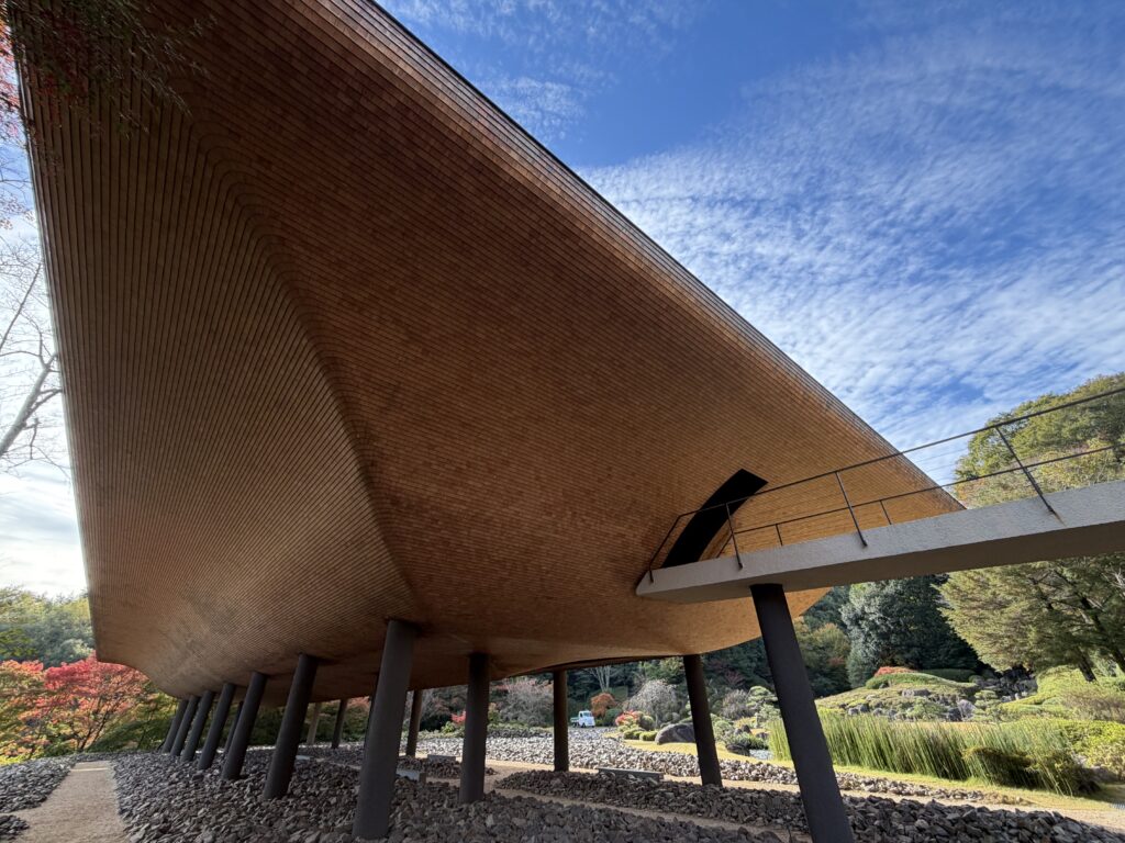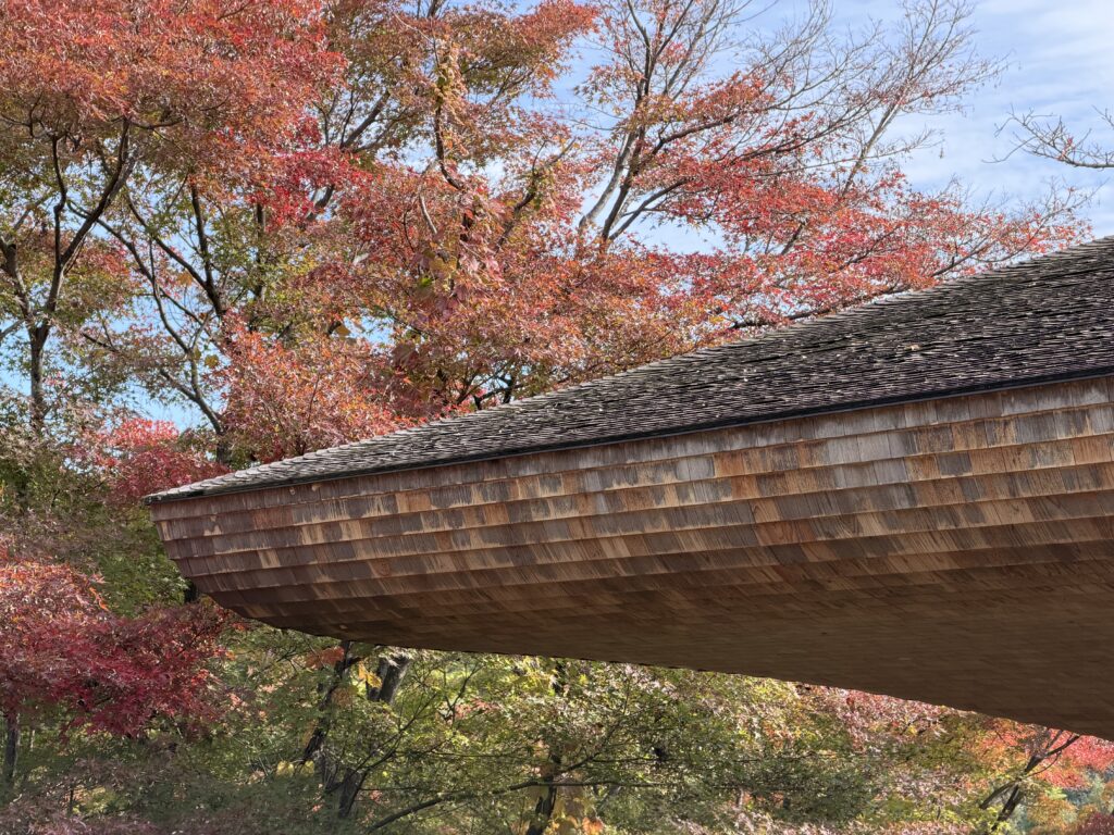 建物の外装は伝統的な杮葺き(こけらぶき)の工法で、約59万枚のサワラの板材を用いてワンマテリアルで仕上げられているそうです。